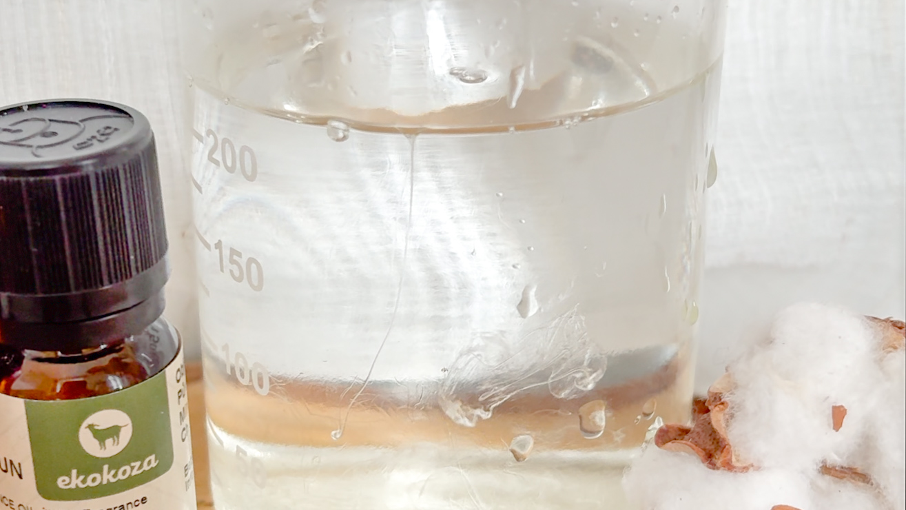 La magie de l'émulsion : Ajoutez le conservateur Cosgard, fermez hermétiquement la bouteille et secouez vigoureusement. Vous verrez l'eau claire se transformer instantanément en un bel assouplissant blanc laiteux. Grâce au Polysorbate, l'huile et l'eau se mélangent parfaitement.